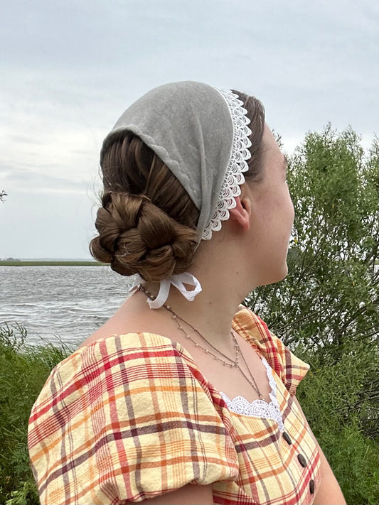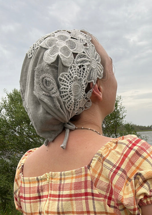 Rolled Jeweled Headband Covering in Cream Lace